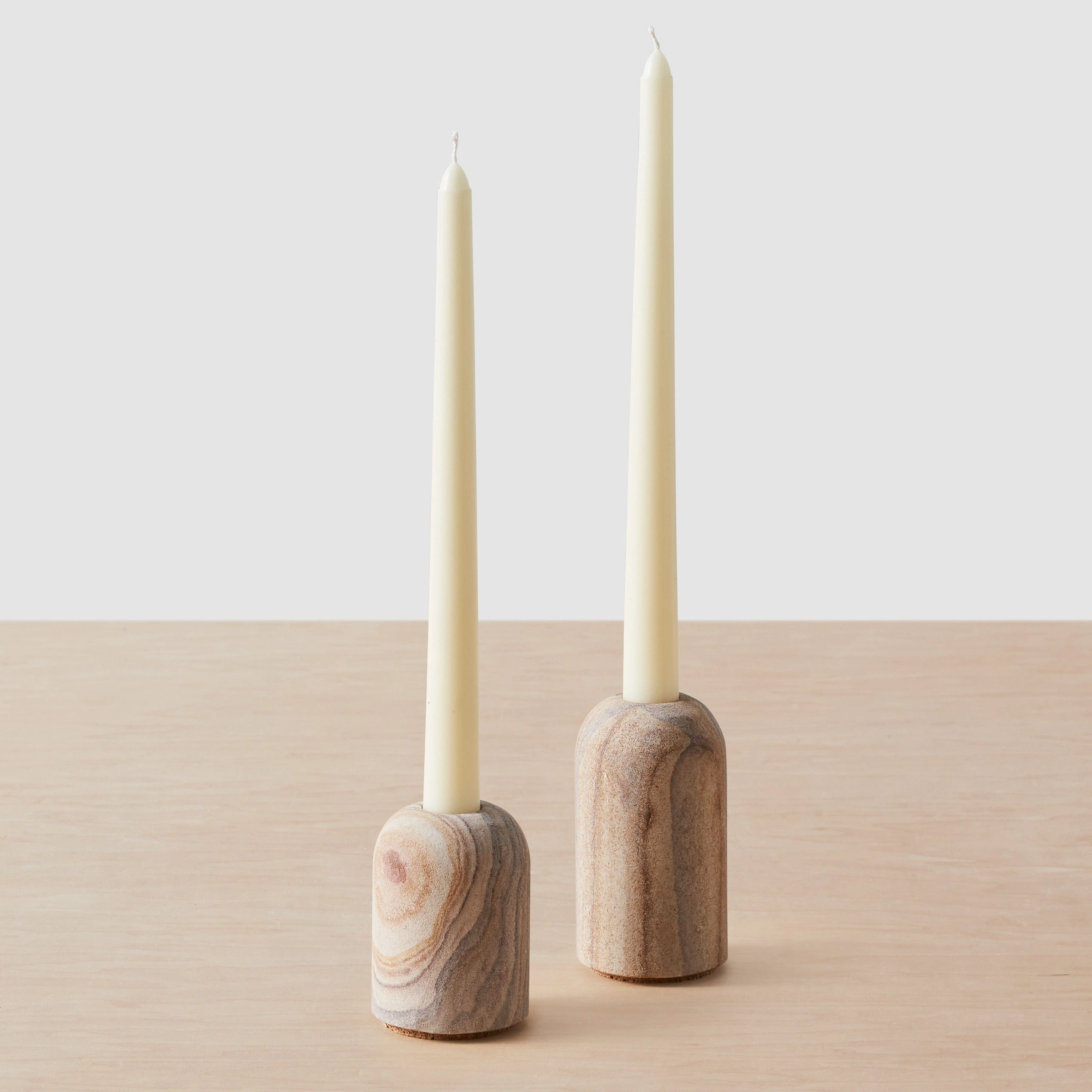 A tablescape isn’t complete without the warm glow of these minimal candle holders, carved from beautiful rainbow sandstone. Flecked with distinctive shades of red, violet, and brown veining, each piece is a sculptural accent that’s truly one of a kind. Fits standard 3/4" taper candles.